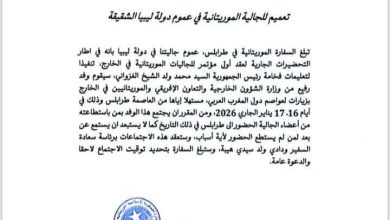 عمّمت سفارة الجمهورية الإسلامية الموريتانية في طرابلس إشعارًا موجهًا إلى عموم أفراد الجالية الموريتانية المقيمة في ليبيا، دعتهم فيه إلى…
