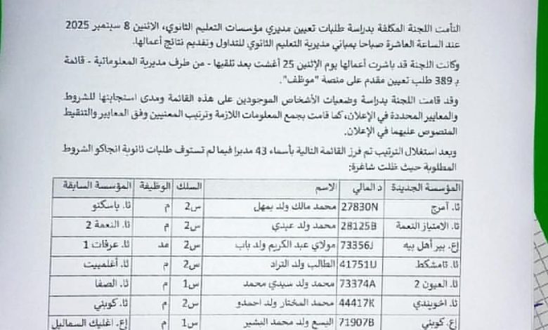 اعتمدت وزارة التهذيب الوطني وإصلاح النظام التعليمي، ممثلة في مديرية التعليم الثانوي، قائمة جديدة من المعينين في مؤسسات التعليم الثانوي، وذلك بناءً على محضر اجتماع اللجنة المكلفة بدراسة طلبات التعيين، المنعقد يوم الاثنين 8 سبتمبر 2025.