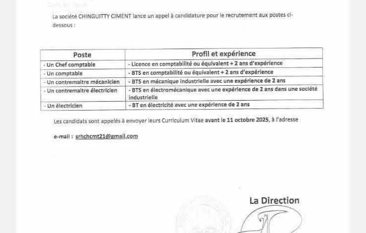 تعلن شركة CHINGUITTY CIMENT عن فتح باب التقديم للتوظيف في الوظائف التالية: