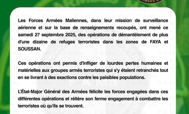 أعلنت القوات المسلحة المالية، في بيان رسمي صادر ظهر اليوم السبت 27 سبتمبر 2025، عن تنفيذ عمليات عسكرية واسعة استهدفت أكثر من عشرة مواقع وصفها البيان بـ”ملاجئ إرهابية” في منطقتي “فايا” و”سوسان”.