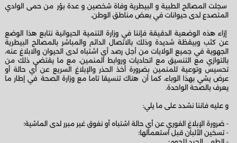 سجلت المصالح الطبية و البيطرية وفاة شخصين و عدة بؤر من حمى الوادي المتصدع لدى حيوانات في بعض مناطق الوطن.