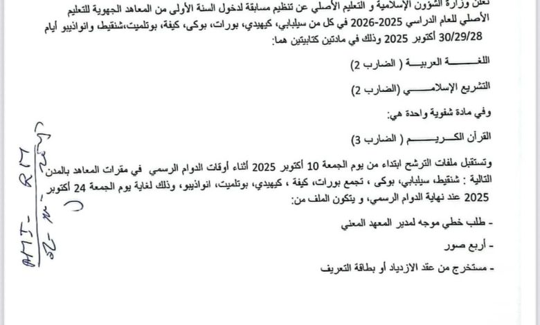 وسيبدأ استقبال ملفات الترشح يوم الجمعة 10 أكتوبر 2025 في مقرات المعاهد الجهوية، ويستمر إلى غاية الجمعة 24 أكتوبر 2025، خلال أوقات الدوام الرسمي.
