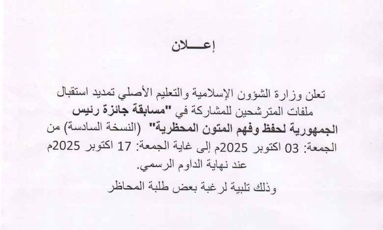 وأكدت الوزارة أن قرار التمديد جاء استجابة لرغبة عدد من طلبة المحاظر، الراغبين في المشاركة في هذه المسابقة الوطنية التي تهدف إلى تشجيع طلبة المحاظر على التعمق في حفظ المتون وفهمها.
