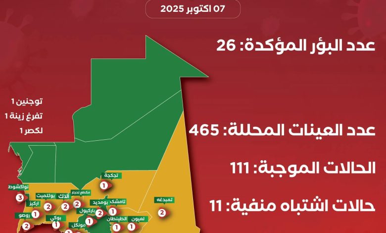 وقد سجلت المصالح البيطرية ، حتى اليوم7 اكتوبر 2025 ،ما مجموعه 26 بؤر ة موزعة على 20 مقاطعة تتبع لعشر ولايات ,كما هو موضح في الصورة.