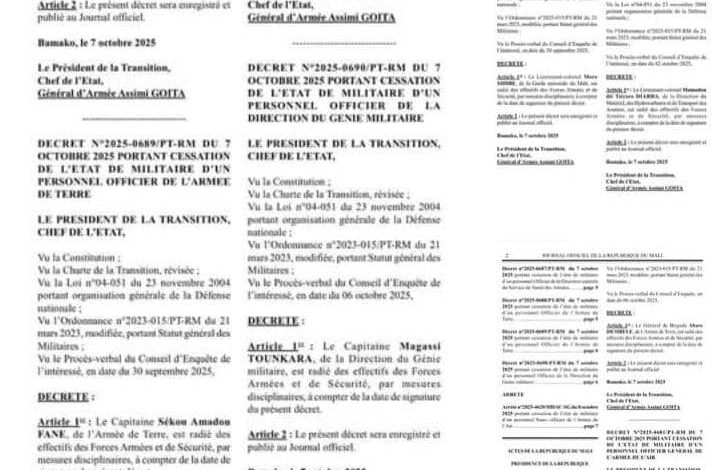 أعلنت السلطات المالية، عبر الجريدة الرسمية، عن فصل 11 عسكرياً من الخدمة، من بينهم جنرالان وعدد من الضباط والجنود من مختلف الرتب، على خلفية اتهامهم بالتورط في التخطيط لمحاولة انقلابية خلال شهر أغسطس الماضي.