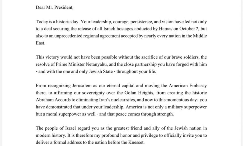 وجاء في الدعوة الموجهو لترامب: “اليوم يوم تاريخي. لقد أدت قيادتك ليس فقط إلى اتفاق يضمن إطلاق سراح الرهائن، بل أيضًا إلى اتفاق غير مسبوق قبلته جميع دول الشرق الأوسط تقريبا”.