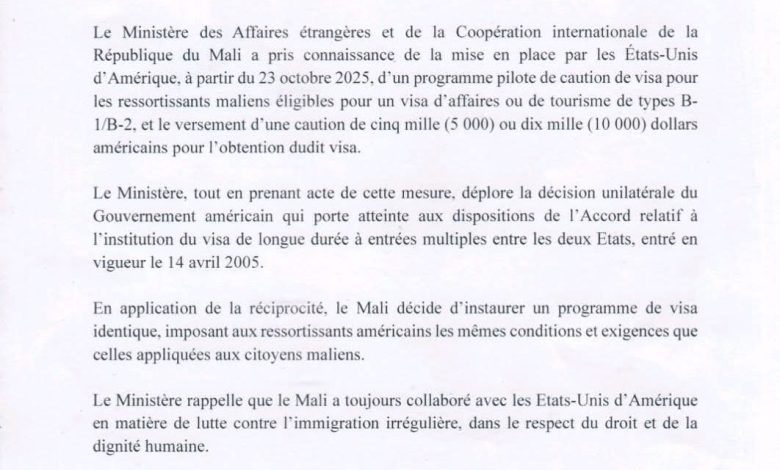 أعلنت وزارة الشؤون الخارجية والتعاون الدولي في جمهورية مالي، في بيان صادر اليوم 11 أكتوبر 2025، عن اتخاذها قرارًا بالرد على إجراء أمريكي جديد يفرض ضمانًا ماليًا للحصول على تأشيرات سياحية أو تجارية للمواطنين الماليين.