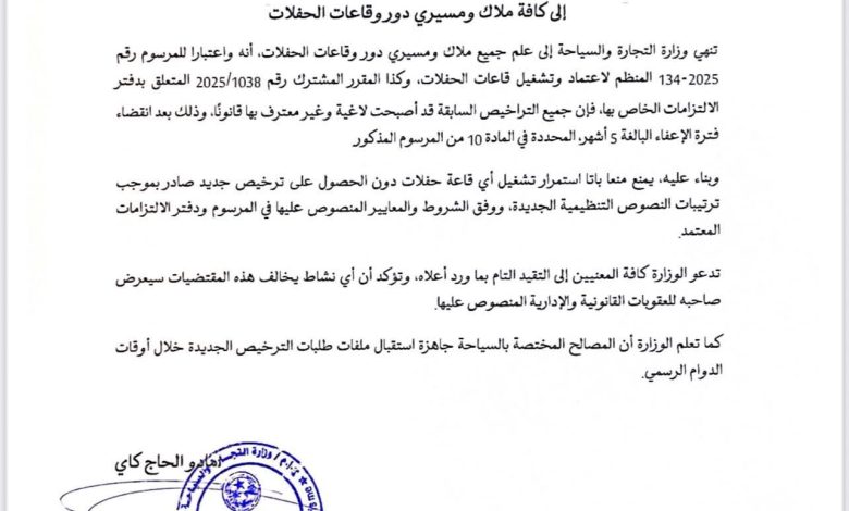 وأوضح البلاغ، الصادر عن الأمين العام للوزارة السيد الحاج كاي، أن القرار يأتي تطبيقا لمقتضيات المرسوم رقم 1038/2025 الذي ينظم الأنشطة المتعلقة بدور وقاعات الحفلات، والذي نصّ على ضرورة حصول جميع المنشآت المعنية على تراخيص جديدة وفق الشروط والمعايير المحددة في النصوص القانونية المعمول بها.