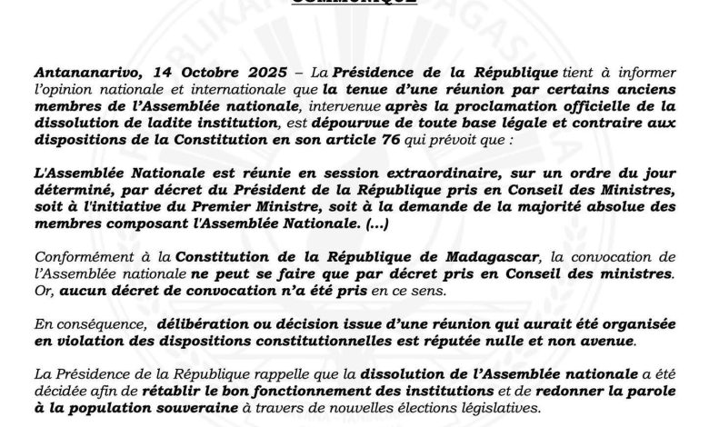 أصدر رئيس جمهورية مدغشقر بيانًا قبل قليل أكد فيه أن الاجتماع الذي عقده عدد من أعضاء الجمعية الوطنية المنحلة لا يستند إلى أي أساس قانوني ويُعد مخالفًا لأحكام الدستور.