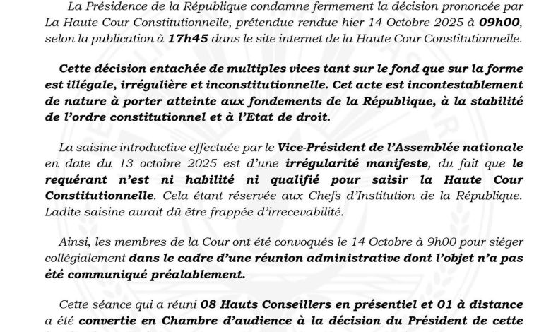 وأضافت الرئاسة أن الجلسة التي بُني عليها القرار شهدت مخالفات إجرائية، بدءًا من تقديم العريضة من طرف نائب رئيس الجمعية الوطنية، وهو طرف غير مؤهل دستوريًا لرفع قضايا أمام المحكمة، وصولًا إلى غياب النصاب القانوني خلال المداولات، حيث حضر فقط 8 مستشارين من أصل 11.