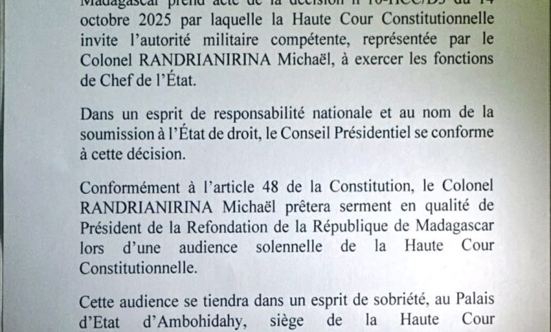 أعلن مجلس الرئاسة لإعادة تأسيس جمهورية مدغشقر أنه أخذ علمًا بقرار المحكمة الدستورية العليا رقم 10-HCC/D3 الصادر في 14 أكتوبر 2025، والذي يقضي بتكليف العقيد ميكائيل راندريانيرينا بممارسة مهام رئيس الدولة.