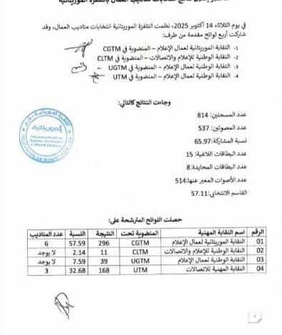 في أول مشاركة انتخابية لها، حققت النقابة الموريتانية لعمال الإعلام فوزًا كاسحًا في انتخابات مناديب عمال التلفزة الموريتانية، بحصولها على ثلثي عدد المقاعد المخصصة للمناديب، في الاستحقاقات التي جرت يوم الأحد 14 أكتوبر 2025.