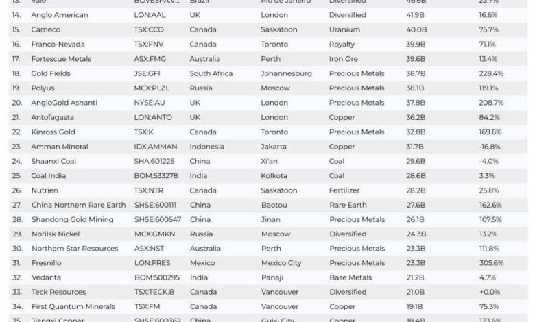 احتلت شركة Southern Copper المكسيكية المركز الرابع بقيمة سوقية بلغت 106.8 مليار دولار، فيما جاءت شركة Newmont الأمريكية في المركز الخامس بقيمة 101.9 مليار دولار، وسجلت قفزة سنوية استثنائية بلغت 134.2%، مدفوعة بارتفاع أسعار الذهب والطلب العالمي على المعادن الثمينة.
