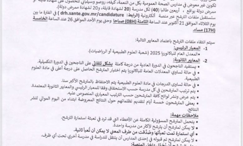 وأضاف الإعلان أن استقبال ملفات الترشح سيتم عبر المنصة الإلكترونية drh.sante.gov.mr/candidature ابتداءً من يوم الثلاثاء 21 أكتوبر عند الساعة الثامنة صباحًا، وحتى يوم الأحد 26 من نفس الشهر عند الساعة الخامسة مساءً.