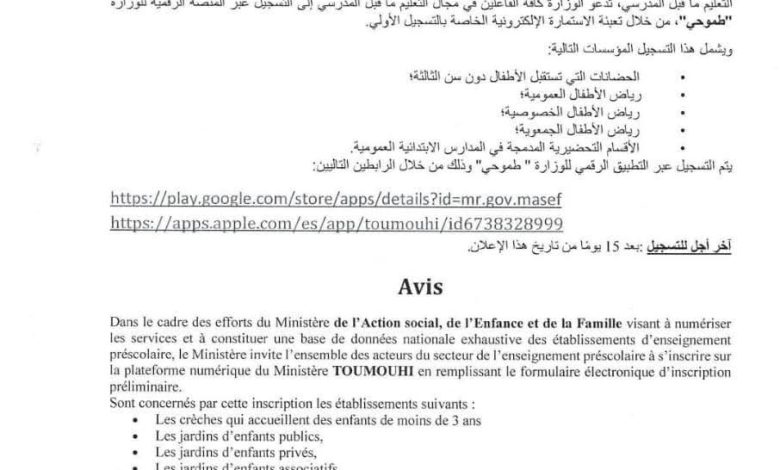ودعت الوزارة في إعلانها جميع الفاعلين في مجال التعليم ما قبل المدرسي إلى التسجيل عبر تعبئة الاستمارة الإلكترونية الخاصة بالتسجيل الأولي، وذلك بهدف حصر وتنظيم المؤسسات العاملة في هذا القطاع وتعزيز جودة الخدمات المقدمة للأطفال في مراحلهم التعليمية الأولى.