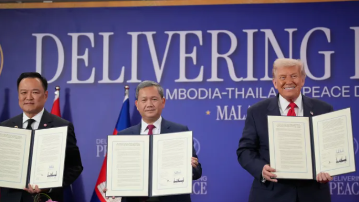 وتم توقيع الاتفاق بين رئيسي الوزراء التايلاندي أنوتين شارنفيراكويل والكمبودي هون مانيه، بحضور ترامب ورئيسُ وزراء ماليزيا أنور إبراهيم، الذي ساهم أيضا في تحقيق وقف إطلاق النار بين قوات تايلاند وكمبوديا على الخط الحدودي.