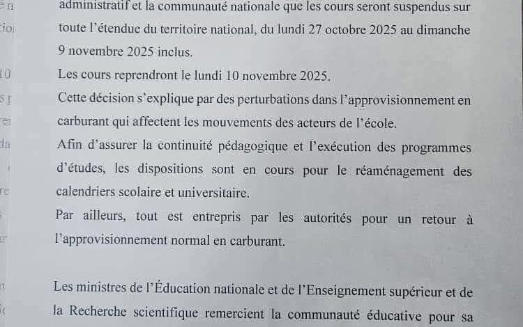 أعلنت وزارتا التربية الوطنية والتعليم العالي والبحث العلمي في مالي، في بيان مشترك، عن تعليق جميع الدروس على عموم التراب الوطني، وذلك ابتداءً من الاثنين 27 أكتوبر الجاري وحتى الأحد 9 نوفمبر 2025، على أن تستأنف الدراسة يوم الاثنين 10 نوفمبر 2025.