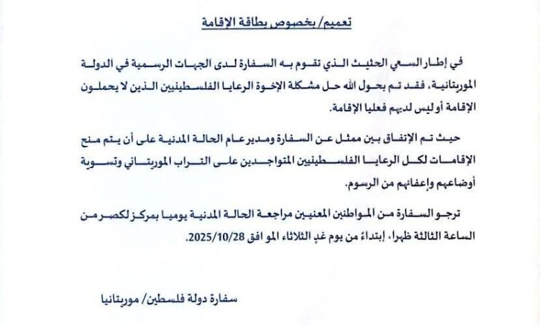 أعلنت سفارة دولة فلسطين في موريتانيا، اليوم الإثنين (27 أكتوبر 2025)، عن التوصل إلى حل لمشكلة الإقامة التي واجهت عدداً من الرعايا الفلسطينيين المقيمين في البلاد، ممن لا يحملون بطاقات إقامة سارية.