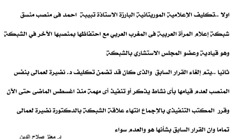 اولا ..تكليف الإعلامية الموريتانية البارزة الاستاذة تبيبة احمد فى منصب منسق شبكة إعلام المرأة العربية فى المغرب العربي مع احتفاظها بمنصبها الآخر في الشبكة وهو قيادية وعضو المجلس الاستشاري بالشبكة