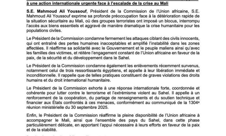 دعا رئيس مفوضية الاتحاد الإفريقي، السيد محمود علي يوسف، إلى تحرك دولي عاجل ومنسق لمواجهة التصعيد الخطير في الأزمة الأمنية والإنسانية في مالي، معبرًا عن قلقه العميق إزاء تدهور الأوضاع الميدانية جراء تصاعد الهجمات الإرهابية وفرض الجماعات المسلحة حصارًا على عدد من المناطق.