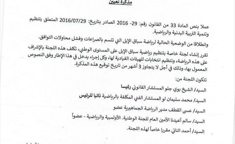 ويأتي هذا القرار – بحسب المذكرة رقم 000701 الصادرة في 20 أكتوبر 2025 – استنادًا إلى أحكام المادة 33 من القانون رقم 29-2016 المنظم للتربية البدنية والرياضية، ونظرًا لما تشهده ساحة سباق الإبل من خلافات وتعثر في محاولات التوافق.