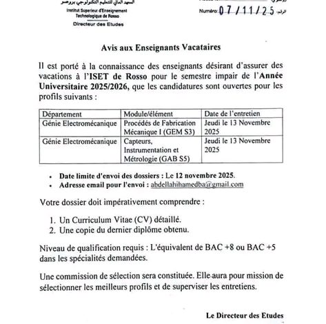 أعلن المعهد العالي للدراسات التكنولوجية بمدينة روصو عن فتح باب الترشح أمام الأساتذة الراغبين في التدريس المؤقت (vacataires) خلال الفصل الأول من العام الجامعي 2025/2026، وذلك في تخصصات محددة ضمن قسم الهندسة الكهربائية والإلكترونية.