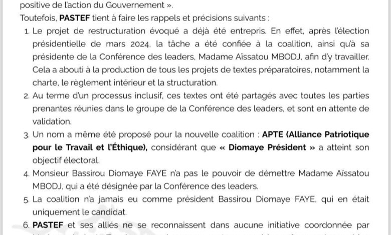 3. تم اقتراح اسم جديد للتحالف هو “APTE” (التحالف الوطني من أجل العمل والأخلاق)، بعد اعتبار أن “Diomaye Président” أدى مهمته الانتخابية.
