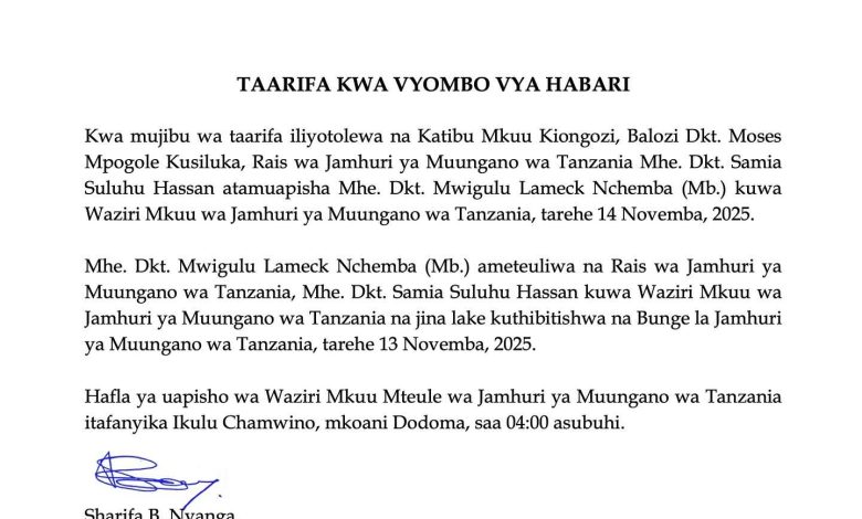 وأوضح البيان أن مراسم أداء اليمين الدستورية لرئيس الوزراء المعيّن ستُقام صباح يوم الجمعة 14 نوفمبر 2025 في القصر الرئاسي بـ«تشاموينو» في مدينة دودوما، في تمام الساعة الرابعة صباحاً بالتوقيت المحلي.