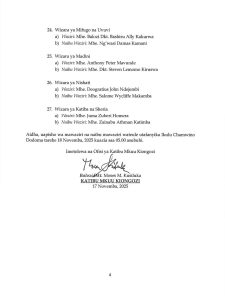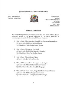أعلنت رئيسة جمهورية تنزانيا، السيدة سامية سولوهو حسن، عن تعديل حكومي واسع، شمل تعيين 27 وزيرًا و29 نائب وزير، وذلك ابتداءً من 17 نوفمبر 2025، وفقًا لبيان رسمي صادر عن رئاسة الجمهورية في دودوما.