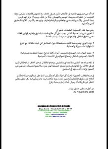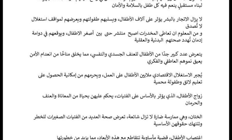 واختتم البيان بالدعوة إلى شراكة شاملة بين الدولة والمجتمع المدني من أجل بناء بيئة آمنة تحمي الطفل وتضمن له حقوقه الكاملة في التعليم والصحة والرعاية.