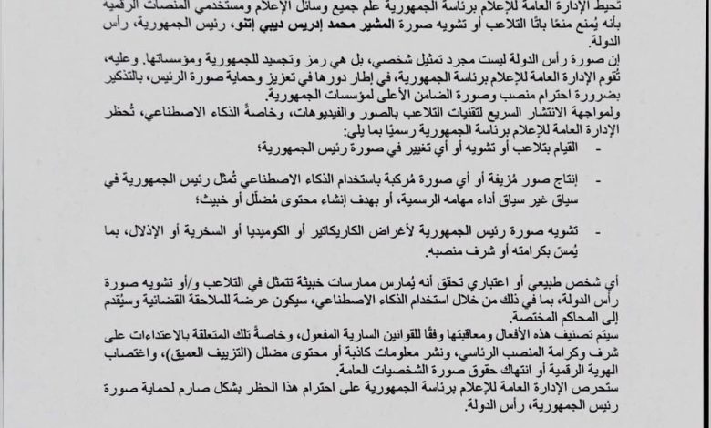 وختمت الإدارة العامة للإعلام بيانها بالتأكيد على “أهمية مواجهة الانتشار السريع للمحتوى المزيف والصور المفبركة”، مشيرة إلى أن حماية الصورة الرسمية للرئيس جزء من حماية مؤسسات الدولة.
