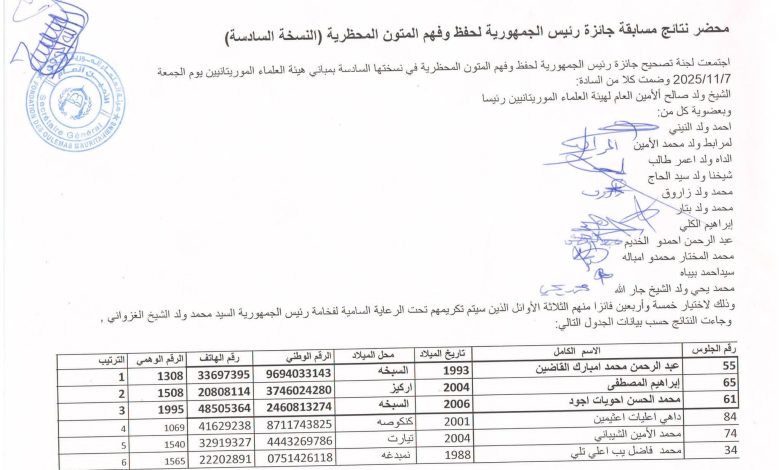 وأشادت لجنة التصحيح بالمستوى الرفيع الذي أبان عنه المتسابقون هذا العام، مؤكدة أن المسابقة تشكل إحدى أهم المبادرات الوطنية الهادفة إلى دعم المحظرة الموريتانية وترسيخ دورها في نشر العلم الشرعي والمعارف الأصيلة.