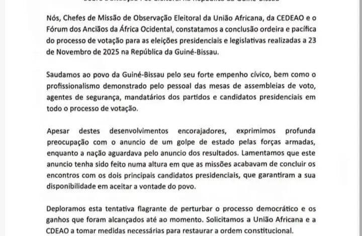 أدانت بعثات مراقبة الانتخابات التابعة للاتحاد الإفريقي، والمجموعة الاقتصادية لدول غرب إفريقيا (الإيكواس)، ومنتدى حكماء إفريقيا الغربية، اليوم الأربعاء، ما وصفته بـ”محاولة الانقلاب الفاضحة” في غينيا بيساو، وذلك عقب الانتخابات الرئاسية والتشريعية التي جرت في 23 نوفمبر 2025.