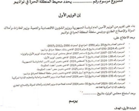أصدر مجلس الوزراء مرسوماً جديداً يحدد حدود ومكونات محيط المنطقة الحرة في مدينة نواذيبو، متضمناً إنشاء قطبين متخصصين أحدهما للمعادن بمساحة 1282 متر مربع، والآخر للصيد على مساحة 221 هكتار، وذلك في إطار تعزيز الديناميكية الاقتصادية للمنطقة وتوجيه الاستثمار نحو القطاعات الإستراتيجية.