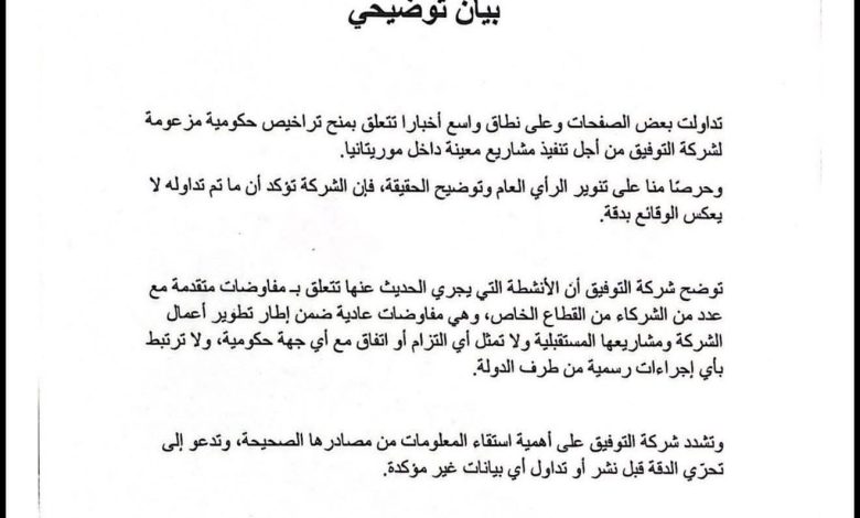 أصدرت شركة التوفيق بيانًا توضيحيًا، اليوم الاثنين 8 دجمبر 2025، نفت فيه صحة الأخبار التي تم تداولها عبر بعض المنصات الإعلامية ومواقع التواصل الاجتماعي بشأن حصولها على تراخيص حكومية لتنفيذ مشاريع داخل موريتانيا.