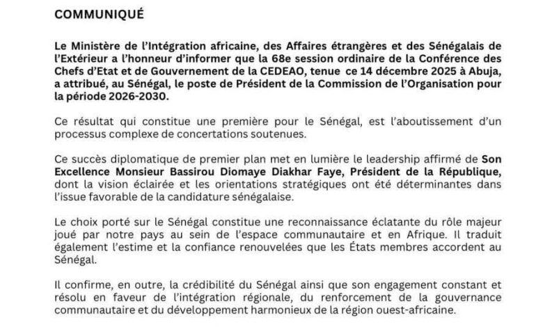 كما أكد البيان أن هذا القرار يعزز مصداقية السنغال والتزامها الثابت بدعم الاندماج الإقليمي، وترسيخ الحوكمة المجتمعية، وتعزيز التنمية المتوازنة والمستدامة في غرب إفريقيا.