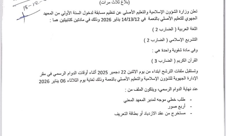 أعلنت وزارة الشؤون الإسلامية والتعليم الأصلي عن تنظيم مسابقة لاكتتاب طلاب السنة الأولى بالمعهد الجهوي للتعليم الأصلي بمدينة النعمة، وذلك أيام 12 و13 و14 يناير 2026.