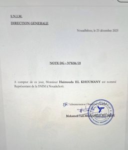 أعلنت الإدارة العامة للشركة الوطنية للصناعة والمناجم (اسنيم) عن تعيين السيد حيموده الخوماني ممثلا للشركة في مدينة نواكشوط، وذلك ابتداء من اليوم.