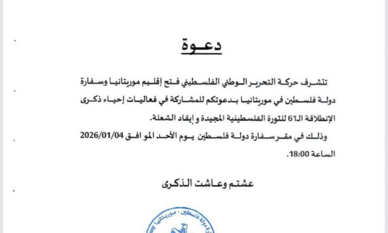 وجّهت حركة التحرير الوطني الفلسطيني (فتح) – إقليم موريتانيا، وسفارة دولة فلسطين في موريتانيا، دعوة إلى الفعاليات السياسية والوطنية وأبناء الجالية الفلسطينية للمشاركة في إحياء الذكرى الـ61 لانطلاقة الثورة الفلسطينية المجيدة، وإيقاد شعلة المناسبة.