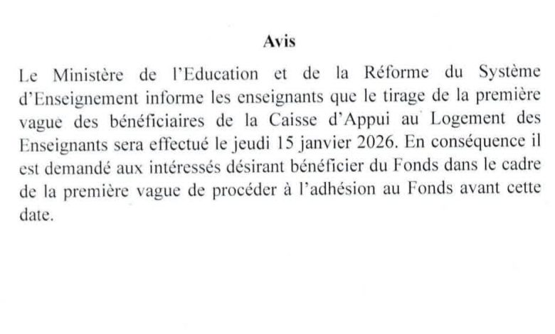ترفع وزارة التربية وإصلاح النظام التعليمي إلى علم المدرسين أن سحب لائحة الدفعة الأولى من المستفيدين من صندوق دعم سكن المدرسين سيتم يوم الخميس 15 يناير 2026. وبناء عليه يرجى من المعنيين الراغبين في الاستفادة من الصندوق ضمن الدفعة الأولى المبادرة إلى التسجيل قبل هذا التاريخ.