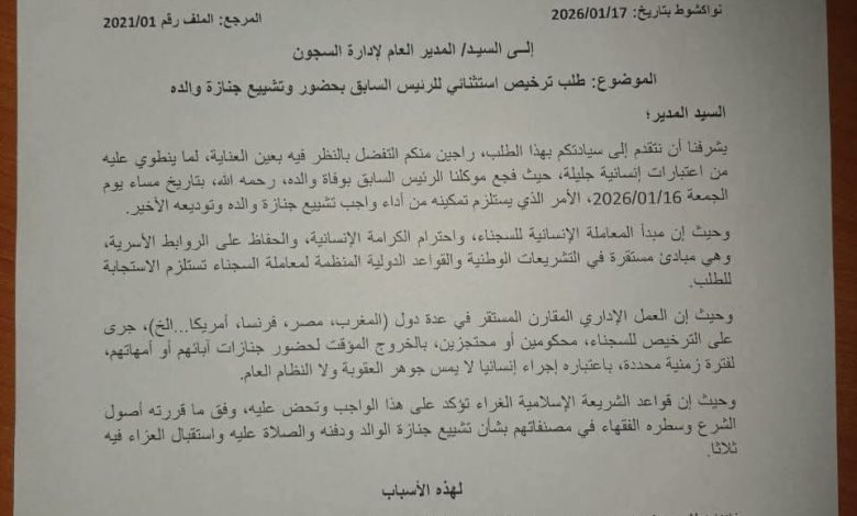 جاء ذلك في رسالة وجهها فريق الدفاع للإدارة العامة للسجون طالب فيها بترخيص استثنائي لولد عبد العزيز يتيح له حضور صلاة الجنازة على والده واستقبال التعازي لمدة ثلاثة أيام.