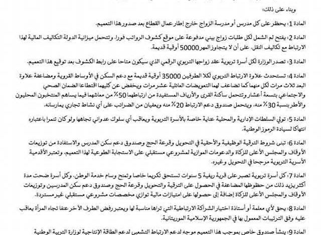 الوثيقة المتداولة، التي قُدّمت بصيغة تعميم رسمي، تضمنت بنودًا تتحدث عن “تنظيم الزواج داخل الأسرة التربوية” وربطه بجملة من الامتيازات والدعم الاجتماعي، غير أنها تفتقر إلى أبسط المعايير الشكلية المعتمدة في المراسلات الحكومية، إذ لا تحمل تاريخًا ولا رقمًا مرجعيًا، ولا تسلسلًا إداريًا واضحًا، كما تخلو من الصيغة القانونية المعهودة للوثائق الصادرة عن القطاعات الرسمية.