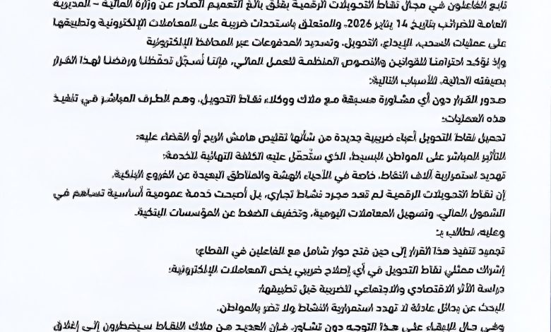 وحذّر البيان من أن انعكاسات القرار لن تقتصر على العاملين في القطاع، بل ستمسّ بشكل مباشر المواطن، الذي سيتحمل الكلفة النهائية للخدمة، مشيرًا إلى أن ذلك يهدد استمرارية آلاف نقاط التحويل الرقمي التي تحولت إلى خدمة عمومية أساسية تساهم في تعزيز الشمول المالي.