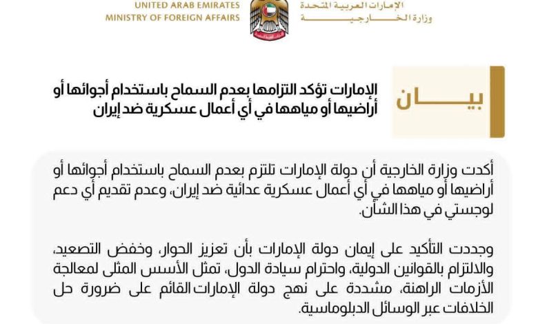 أكدت دولة الإمارات العربية المتحدة التزامها بعدم السماح باستخدام أجوائها أو أراضيها أو مياهها في أي أعمال عسكرية ضد الجمهورية الإسلامية الإيرانية، مشددة على أنها لن تقدم أي دعم لوجستي في هذا الشأن.