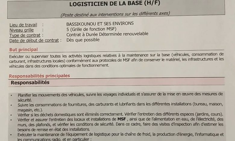 أعلنت منظمة أطباء بلا حدود – فرنسا عن فتح باب الترشح لتوظيف مسؤول لوجستي للقاعدة بمدينة باسكنو، وذلك في إطار تعزيز قدراتها اللوجستية الداعمة للأنشطة الصحية والإنسانية التي تنفذها بالمنطقة.
