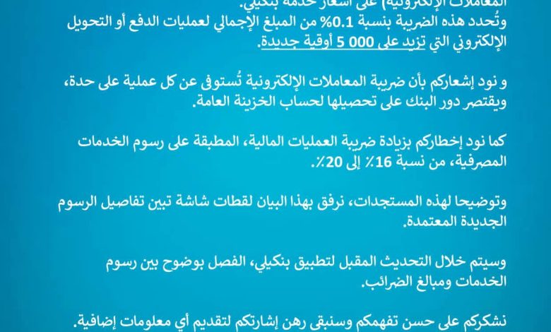 وأشار البنك إلى أنه سيرفق توضيحات مفصلة حول الرسوم الجديدة، كما سيعمل التحديث المقبل لتطبيق “بنكيلي” على إظهار فصل واضح بين رسوم الخدمات ومبالغ الضرائب المفروضة.