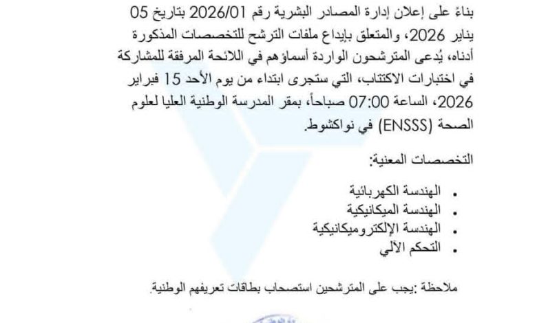 وأوضحت الشركة، في إعلان صادر من مدينة نواذيبو بتاريخ 5 فبراير 2026، أن الاختبارات ستُجرى ابتداءً من يوم الأحد 15 فبراير 2026، عند الساعة السابعة صباحًا، بمقر المدرسة الوطنية العليا لعلوم الصحة (ENSSS) في نواكشوط.