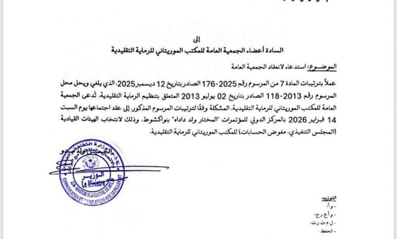 وجاء هذا الاستدعاء، وفق مذكرة صادرة عن الوزير تطبيقًا لمقتضيات المادة السابعة من المرسوم رقم 176-2025 الصادر بتاريخ 12 ديسمبر 2025، الذي يلغي ويحل محل المرسوم رقم 118-2013 الصادر بتاريخ 2 يوليو 2013، المنظم للمكتب الموريتاني للرماية التقليدية.