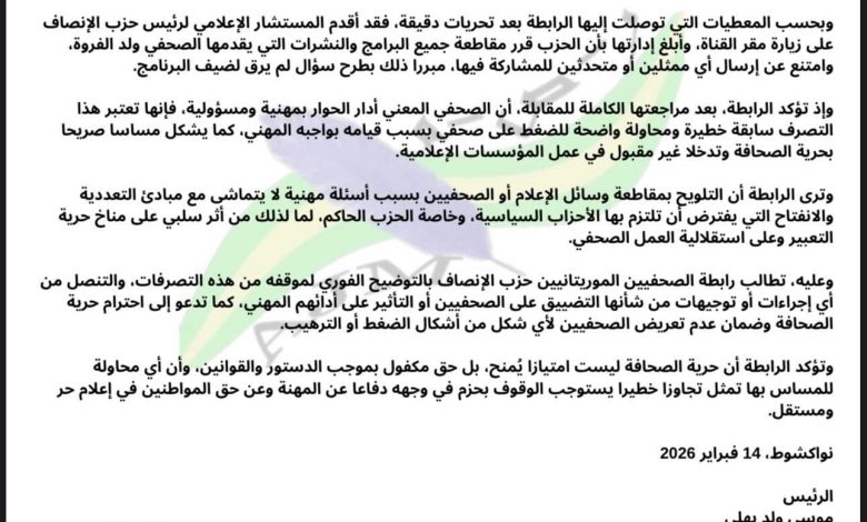 وقالت الرابطة، في بيان صادر عنها مساء اليوم من العاصمة نواكشوط، إنها توصلت بعد تحريات دقيقة إلى أن المستشار الإعلامي لرئيس الحزب قام – وفق ما ورد في البيان – بمقاطعة جميع البرامج والنشاطات التي يديرها الصحفي المذكور، ومنع إرسال أي ممثلين أو متحدثين للمشاركة فيها، مبرراً ذلك بطرح سؤال لم يَرُق لضيف البرنامج.
