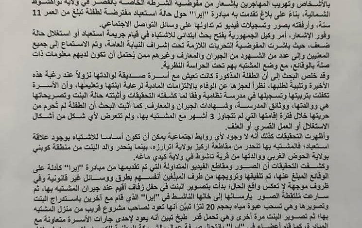 وأوضحت النيابة، في بيان للرأي العام، أنها تلقت بتاريخ 4 فبراير 2026 إشعاراً من مفوضية الشرطة الخاصة بالقُصَّر، بناءً على بلاغ تقدمت به مبادرة إيرا، حول حالة استعباد مفترضة للطفلة، مدعوماً بصور ومقاطع فيديو تم تداولها على مواقع التواصل الاجتماعي.